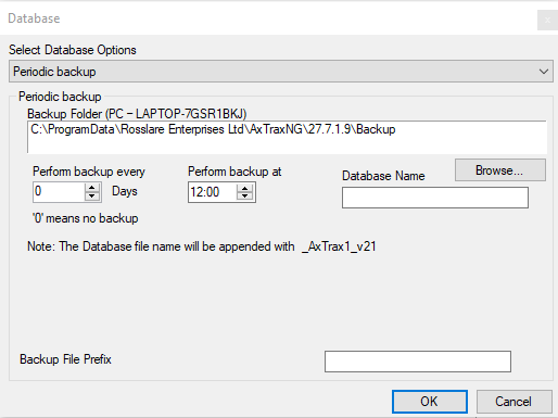 Vaya a Herramientas>Base de datos y seleccione Base de datos periódica. Seleccione la carpeta de respaldo, la cantidad de días (N), la hora y el nombre de la base de datos. AxTrax realizará una copia de seguridad automática muy N días a la hora especificada.