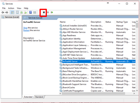 2. Sélectionner le service AxTraxNG server et cliquer sur Stop: